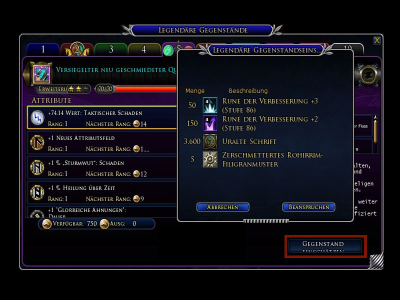 Im alten Fenster für legendäre Gegenstände können diese bewertet werden. Über eure Spielerleiste am unteren Spielfensterrand kommt ihr in das alte Fenster für legendäre Gegenstände. In diesem Fenster findet ihr jetzt einen Button "Gegenstand einschätzen".In einem neuen Fenster erscheinen nun die Gegenstände, die ihr erhalten werdet, wenn ihr den Button "Beanspruchen" klickt. Für die bisher gesteigerten Attribute erhält man Uralte Schriften direkt in den Geldbeutel, sowie Verbesserungsrunen und gebrochene Filigranmuster, welche als Zahlungsmittel beim Tausch gegen unvergleichliche und epische legendäre Gegenstände verwendet werden können.Bei diesem Bewertungsvorgang wird der alte legendäre Gegenstand nicht zerstört. Legendäre Gegenstände können einfach aus dem Beutel gezogen werden, um sie zu löschen.