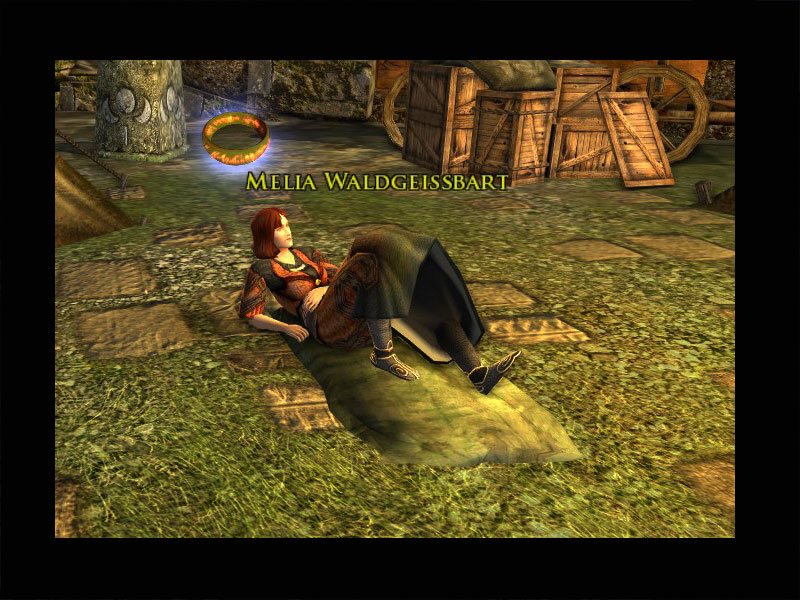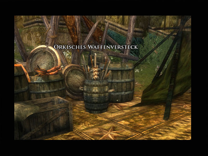 'Ich bin so zornig, dass unsere Reise nach Tharbad von diesen fürchterlichen Orks ruiniert wurde! Ich wünschte, ich könnte geradewegs in ihre Lager spazieren und ihre Dinge zerstören, wie sie es uns vor wenigen Abenden angetan haben! Doch leider bin ich ihnen nicht gewachsen.'.'Ihr dagegen könntet für mich Rache nehmen, nicht wahr? Wenn Ihr eines ihrer Waffenlager findet, zerstört es! Haha! Das wird ihnen eine Lehre sein!'
