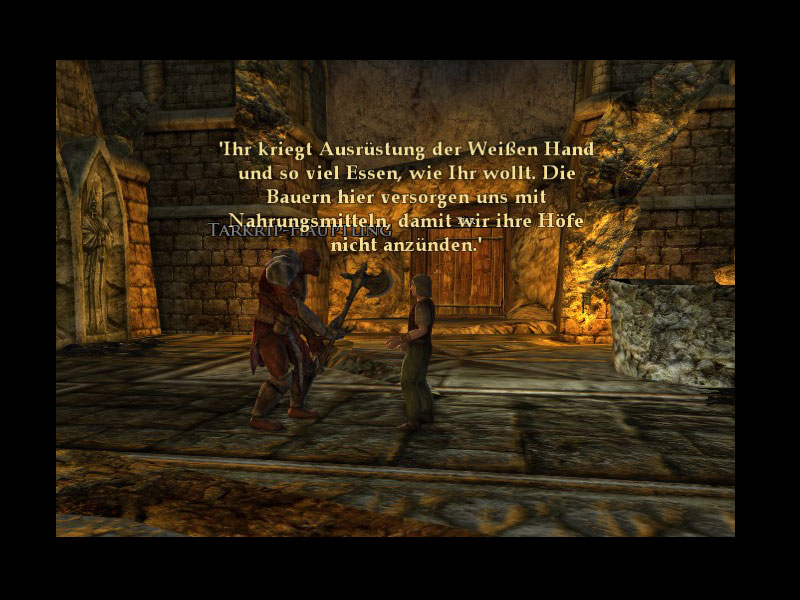 'Eure Bemühungen im Süden haben Euch Informationen über Lutz Farning erbracht, einem Mann mit furchtbaren und eigensinnigen Idealen. Farning hat die Räuber unterstützt, die Scharrer treu ergeben sind, um sich den Tarkrîp-Orks aus dem Norden anzuschließen. Eine solche Allianz würde das Breeland von beiden Seiten unter Druck setzen und die Bevölkerung ins Verderben stürzen. Eure Taten hier im Norden haben uns geholfen, dafür zu sorgen, dass die Orks gebrochen und geschwächt werden.Eure kürzliche Entdeckung der Höhle in den Klippen bei Cirith Nûr hat mich überzeugt, dass diese Höhle einem schrecklichen Zweck dienen soll: Ein Ort, an dem sich Farning mit den Anführern der Orks treffen und ein Bündnis für weitere Einfälle nach Bree aushecken will.Es scheint, Ihr seid auserwählt, diese Invasion abzuwenden und dieses Bündnis ein für allemal zu zerschlagen. Ihr müsst zum Lager bei Cirith Núr zurückkehren und die Höhle betreten, um die Allianz zu stören. Sorgt dafür, dass die Orks und die bösartigen Menschen ihre Pläne nicht umsetzten können. Seid Ihr bereit?'?
