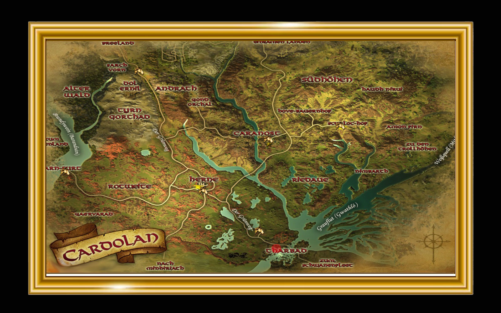'Also, wohin führt diese Straße? Nach Alt-Cardolan, sagt Ihr?'Skardí streicht sich über den Bart.'Da gibt es nicht viel, soweit ich weiß. Wenn man Meneldir reden hört, könnte man meinen, es wäre ein großes Königreich, aber das ist lange her. Ich glaube, es wurde von Krieg und Krankheit verwüstet, und jetzt erinnern sich nur noch Waldläufer und Gelehrte daran - und jene, die das Pech haben, den Waldläufern und Gelehrten zuhören zu müssen!''Ich werde Euch nicht aufhalten. Aber wenn Ihr diesen Weg einschlagt, müsst Ihr den Fluss bei Tharbad überqueren. Die Brücke wurde zerstört, sodass die Überquerung alles andere als angenehm werden wird. Ich wünsche Euch viel Spaß dabei, Elvandis. Ich bleibe lieber hier in meiner Schmiede, wo es trocken und warm ist!'