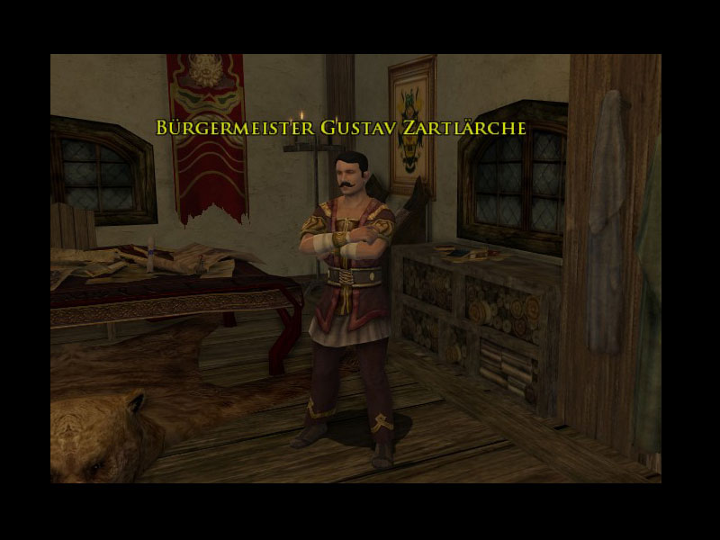 Die Wache hat Eure Ankunft bereits erwartet. Die Neuigkeiten über Eure Taten verbreiten sich schnell und in dieser schrecklichen Zeit ist jeder Hoffnungsschimmer mehr als willkommen. Unser Bürgermeister, Gustav Zartlärche, wünscht mit Euch zu sprechen. Ihr findet ihn im Rathaus.Geht auf der Straße Richtung Süden und haltet nach dem großen steinernen Platz Ausschau. Dort befindet sich auch der Eingang des Rathauses. Geht hinein und sprecht mit dem Bürgermeister.'