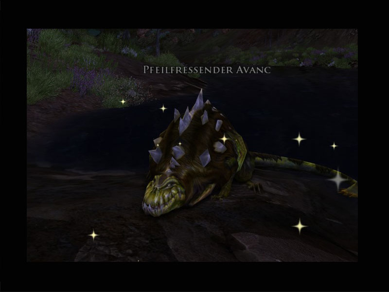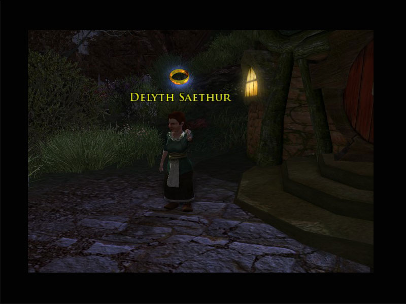 'Oh, hallo! Ich heiße Delyth Saethur. Ob Ihr mir wohl helfen könnt? Ich habe mit meinem Bogen geübt, aber einmal ein bisschen danebengeschossen. Ich bin dem Pfeil gefolgt, aber wenn ich mir die Abdrücke so ansehe, scheint sich eine große Kreatur damit davongemacht zu haben.''Wenn Ihr flussabwärts unterwegs seid und meinen Pfeil seht oder die große Kreatur findet, könntet Ihr mir das Ding dann zurückbringen? Also natürlich den Pfeil, nicht die große Kreatur.'