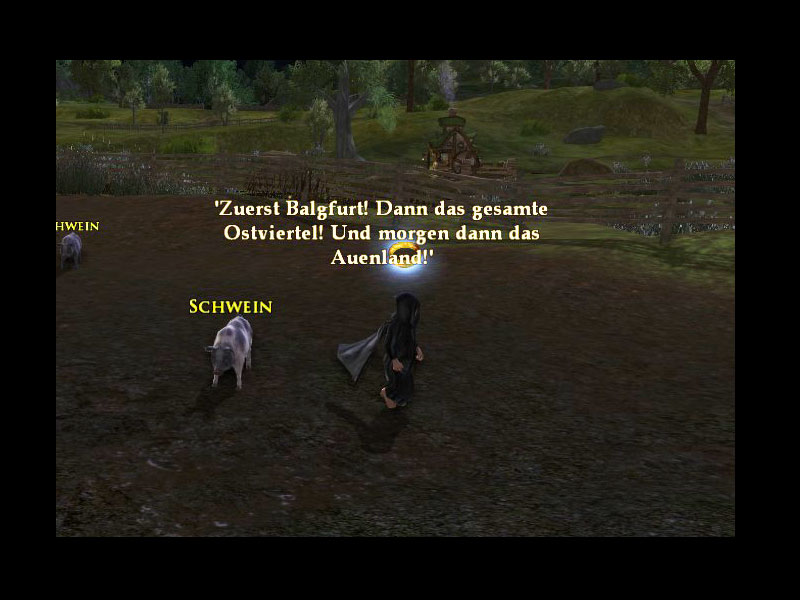 'Ich muss Euch sagen, ich habe ein wirkliches Problem! Meine Gehilfen sagen, sie hätten jemanden aus dem Großen Volk in einem schwarzen Umhang nachts um meine Schweineställe schleichen sehen.Ich habe daran gedacht, den Hof an Lotho Sackheim-Beutlin zu verkaufen, und die Geschichte mit diesem Schwarzen Reiter bestärkt mich nur noch mehr in meiner Absicht. Ich bin froh, dass Lotho den Hof immer noch kaufen will, trotz all der seltsamen Fremden, die in letzter Zeit durch das Auenland streifen.Aber ich weiß immer noch nicht, was wirklich vorgeht. Vielleicht haben meine Gehilfen ja auch nur Angst vor Schatten. Ich bitte Euch, für mich die Wahrheit herauszufinden. Bitte begebt Euch in der Nacht zu den Ställen am Fluss südlich von hier und seht nach, was dort los ist.'