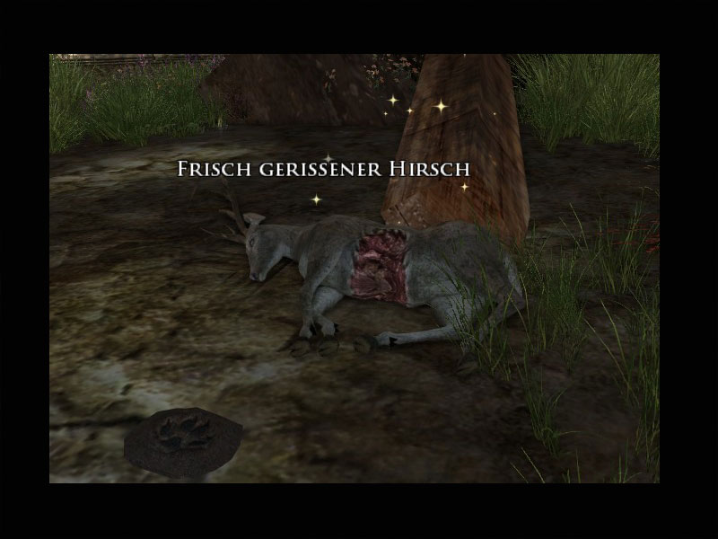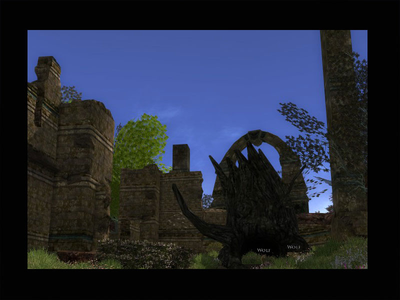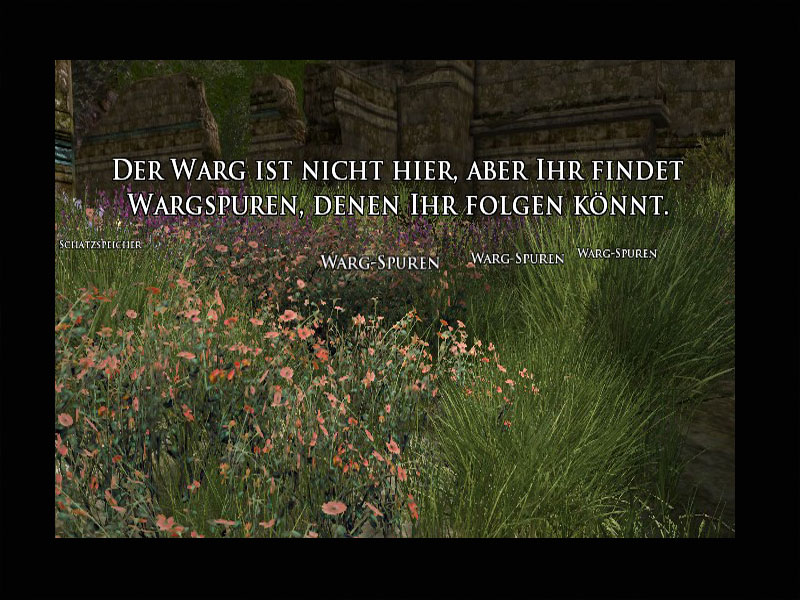 'Seht dort, meine Liebe. Die Ruinen im Osten dienen seit Langem einem Rudel Wölfe als Zuhause. Sie waren immer zufrieden damit, uns in Ruhe zu lassen, und wir taten es ihnen zu gern gleich. Etwas scheint diesen ungeschriebenen Vertrag gebrochen zu haben. Die Wölfe sind aggressiv geworden. Ich wagte es, mich den Ruinen zu nähern, und sah eine große Bestie, einen Warg, unter ihnen.''Ich hielt es zuerst für Einbildung. Warge sind Monster, von denen wir Kindern erzählen, damit diese sich benehmen!''Wir haben alle Hände voll zu tun, Mooshang wieder aufzubauen und uns von dem Angriff zu erholen. Uns fehlt die Kraft, diese Bestie zu bekämpfen. Wenn Ihr den Warg bezwingt, erspart Ihr uns ebenso wie den Wölfen unnötigen Konflikt.'