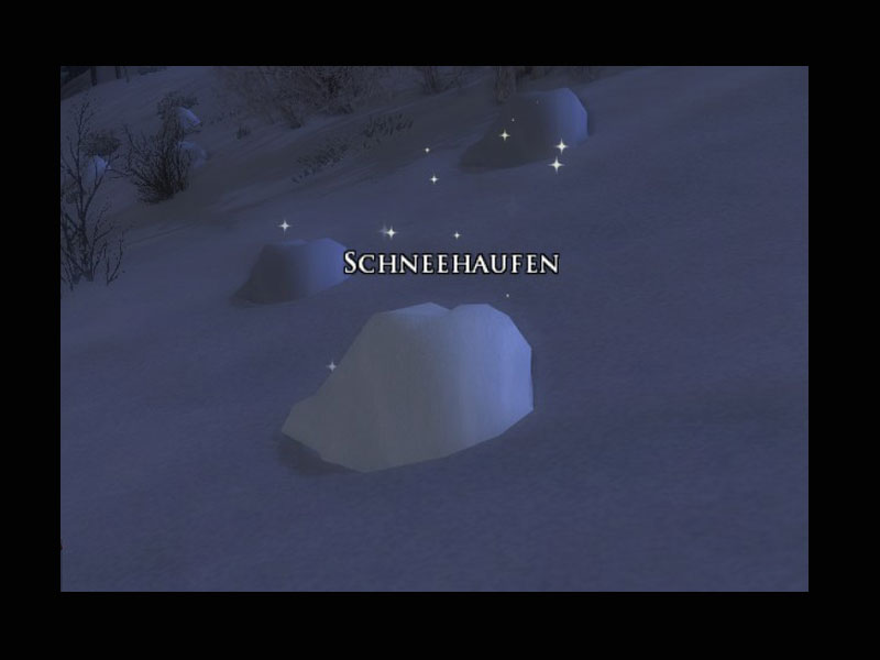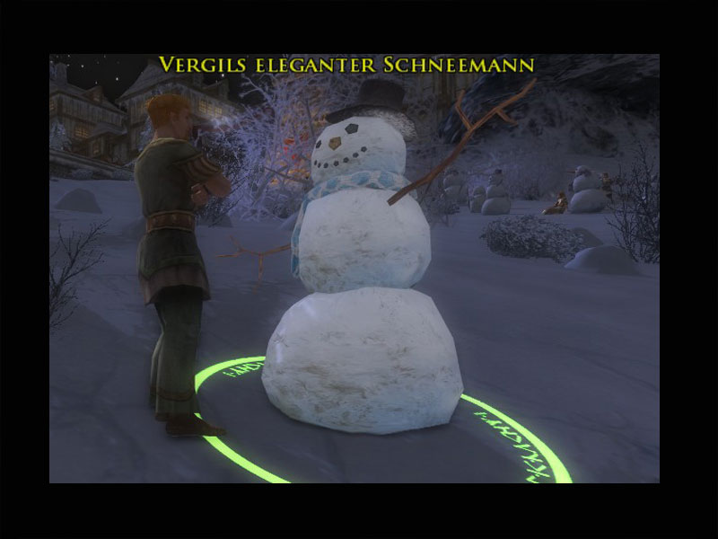 Dies ist einer von Vergils Schneemännern. Mit diesem Schneemann hat Vergil wohl versucht, bei Bürgermeister Gutnich Anklang zu finden. Er ist wahrhaft der edelste Schneemann in Frostfels.Um an die Handwerkskunst von Vergil heranzukommen, benötigt Ihr einen Zylinder, einen Schal, Stöcke, eine Eichel und Kohle. Vielleicht könnt Ihr die benötigten Gegenstände ja in Frostfels entdecken.