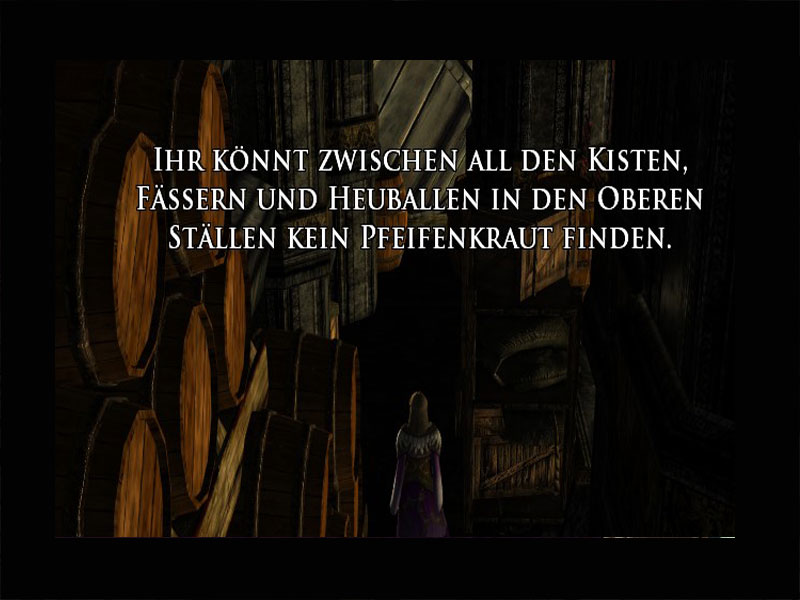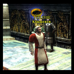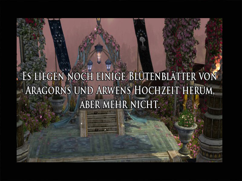 'Hallo, Elvandis! Ihr seid doch nicht schon etwa müde, oder?''Ich habe genau das Richtige, um dieses Bankett etwas zu beleben! Ich ... weiß nur leider nicht, wo ich es gelassen habe.''In Isengart habe ich mir etwas Langgrundblatt eingepackt, das wir im Lager gefunden haben. Da oben in seinem Turm hat Saruman es ganz sicher nicht gebraucht!''Na ja, wie dem auch sei, ich weiß, dass ich mein Pfeifenkraut bei den Bädern im Großen Gästehaus, in den Oberen Ställen und auf dem Bug von Minas Tirith aus der Tasche geholt habe. Es muss also an einem der drei Orte sein!''Wenn Ihr es suchen geht, teile ich es nachher gerne mit Euch - und zwar bis zum letzten Krümel!'