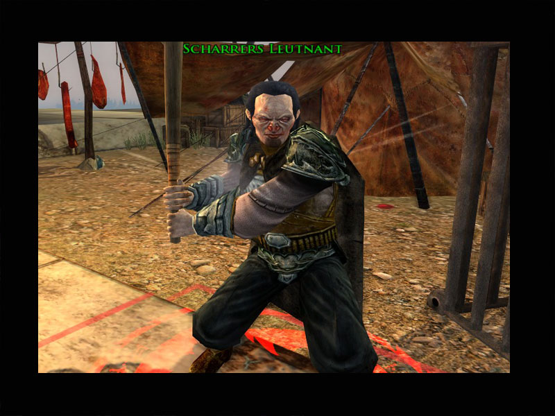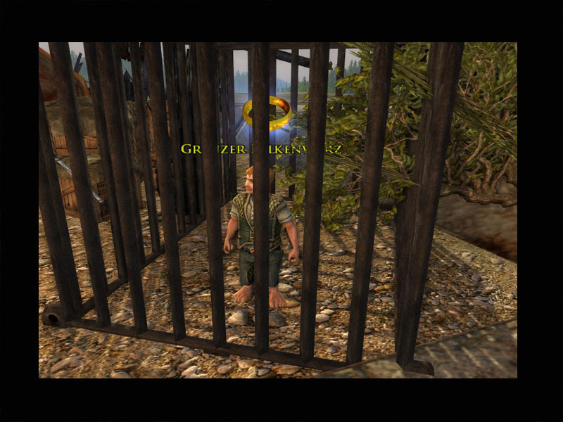 'Was wollt Ihr von mir? Los, raus damit und dann verschwindet!'Ihr stellt Euch vor und fragt, wieso er nicht bei den anderen Raufbolden in den Fernen Auen ist.'Pah! ich liege nicht im Streit mit Euch. Noch nicht zumindest. Ich heiße Mal Fetzenholz, und mein Name hatte hier früher einmal Gewicht! Aber seit der Oberste Landbüttel und Scharrer hier mitmischen, ist das vorbei ...'Mal Fetzenholz spuckt auf den Boden.'Ein paar meiner Jungs sagen, dass sie einen von Scharrers Leuten dabei beobachtet haben, wie er Medaillons unter den Leuten verteilt hat, um sie für Scharrer zu gewinnen. Wenn man sich ihre Loyalität so einfach erkaufen kann, dann können sie mir gestohlen bleiben!''Wie dem auch sei, Scharrer hat einen Leutnant oben in Taerhad. Ich habe gehört, dass er einen dieser Halblinge mit so einer Federkappe gefangen genommen hat. Gerüchten zufolge hat er sie zum Fressen gern. Würde ich diesen Halborks durchaus zutrauen - das sind wirklich bösartige Gesellen! Mir ist eigentlich gleich, was mit diesem Halbling passiert, aber wenn jemand Scharrers Leutnant aus dem Weg räumen könnte ... Das wäre natürlich was ganz anderes, nicht wahr?''Wenn Ihr dem Halbling ohnehin helfen wollt, könnt Ihr mir doch gleich einen Gefallen tun, oder?'