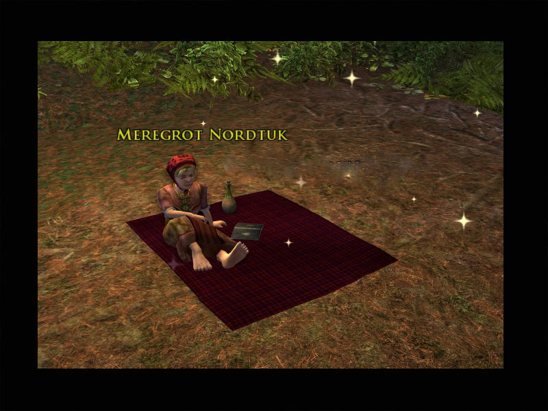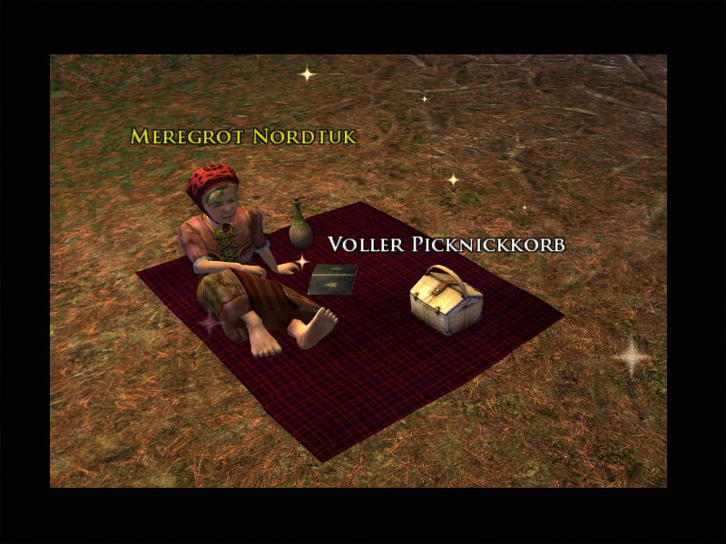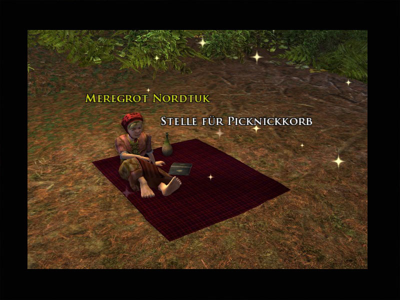 'Ist es nicht herrlich, einfach nur am Wasser zu sitzen und sich ein wenig Ruhe von all der Hektik zu gönnen? Meine Tochter Rosa könnte gewiss auch ein Päuschen gebrauchen. Sie bürdet sich immer zu viel auf. Sagt mal, solltet Ihr nicht selbst gerade zu viel zu tun haben, würdet Ihr mir dann vielleicht einen Gefallen tun?'n'Rosa hat wahrscheinlich schon etwas zum Abendbrot eingeplant, aber es könnte nicht schaden, wenn ich auch etwas dazu beitrage. Würdet Ihr mir ein paar Zutaten besorgen? Rosa liebt Wilderdbeeren. Mir sind die zwar zu sauer, aber das Mädchen bekommt einfach nicht genug davon. Ich bevorzuge herzhafte, schmackhafte Pilze! Die Erdbeeren wachsen wild an bestimmten Wegen und die Pilze findet Ihr überall auf dem Waldboden.'