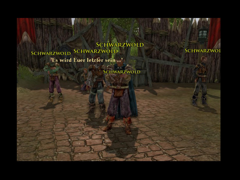 'Ich bin froh, dass Ihr hier seid! Ein paar Schwarzwolds haben uns heute Morgen angegriffen, aber wir haben sie in die Flucht geschlagen.Wir benötigen Hilfe aus Schlucht, der nächsten Stadt. Sie liegt südwestlich von hier, nur eine kurze Reise entfernt. Sie müssen sofort ihre Soldaten nach Archet schicken, um den Überfall zu verhindern!Bitte beeilt Euch - Ich befürchte, die Schwarzwolds wollen schon heute Nacht angreifen. Die Straße wimmelt nur so vor Räubern, aber ich bete, dass Ihr es dennoch sicher nach Schlucht schafft.'