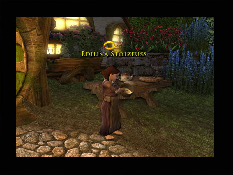 'Oh je! Der Geist treibt immer noch sein Unwesen in meiner Bibliothek. Jedes Mal, wenn ich sie betrete, macht er so ein Spektakel, dass ich mich zu Tode fürchte! Ich bin so nervös, dass ich noch nicht einmal etwas essen kann.Moment! Etwas zu essen! Wie die meisten Hobbits hat der alte Tuk sehr gerne gegessen. Seine Lieblingsspeise waren würzige Keilerrippchen. Ich gebe zu, auch ich mag sie sehr gerne. Vielleicht können wir den Geist besänftigen, wenn wir ihm einen Teller mit würzigen Rippchen anbieten.Sprecht mit meiner Nichte, Edilina Stolzfuß. Ihre Höhle liegt direkt östlich von Groß-Smials, und sie ist eine exzellente Köchin. Aber verratet Ihr nicht, wozu wir die Rippchen brauchen. Ich will keine Panik auslösen!'