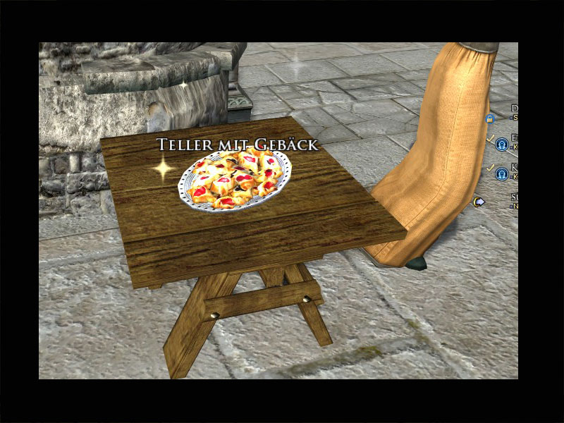 'Ah, Ihr da! Ihr seht aus, als hätte Ihr etwas Zeit. Euch sind sicher die Wachen aufgefallen, die in der Stadt patrouillieren, oder? Trotz der Feierlichkeiten sind sie Tag und Nacht im Dienst. Der Krieg ist allen leider noch sehr präsent.''Die Wachen sind pausenlos für uns im Einsatz, daher möchte ich ihnen eine kleine Freude machen. Und Anerkennung geht, genau wie Liebe, durch den Magen.''Ich habe etwas Gebäck gemacht und zum Auskühlen dort auf den Tisch gestellt. Ich möchte, dass Ihr es unter den hungrigen Wachen in der Gegend verteilt. Los, los! Mein Gebäck soll doch nicht trocken werden.'
